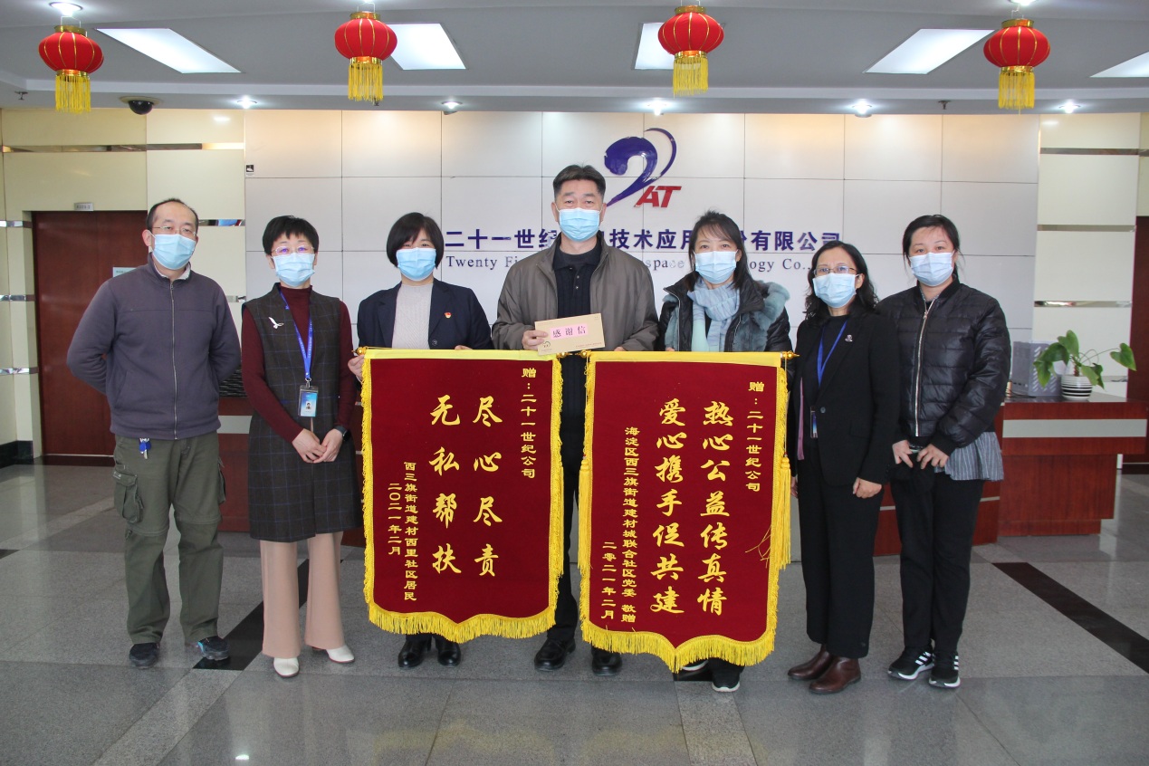 十多年來,公司愛心志愿管理委員會一直堅持組織開展西三旗社區(qū)困難群眾春節(jié)走訪慰問活動。2021年2月24日,西三旗街道建材城聯(lián)合社區(qū)和建材西里社區(qū)領導代表社區(qū)居民送來錦旗,感謝公司全體員工的愛心奉獻和對困難群眾生活的關心關愛,讓社區(qū)特困戶感受到社會大家庭的溫暖。